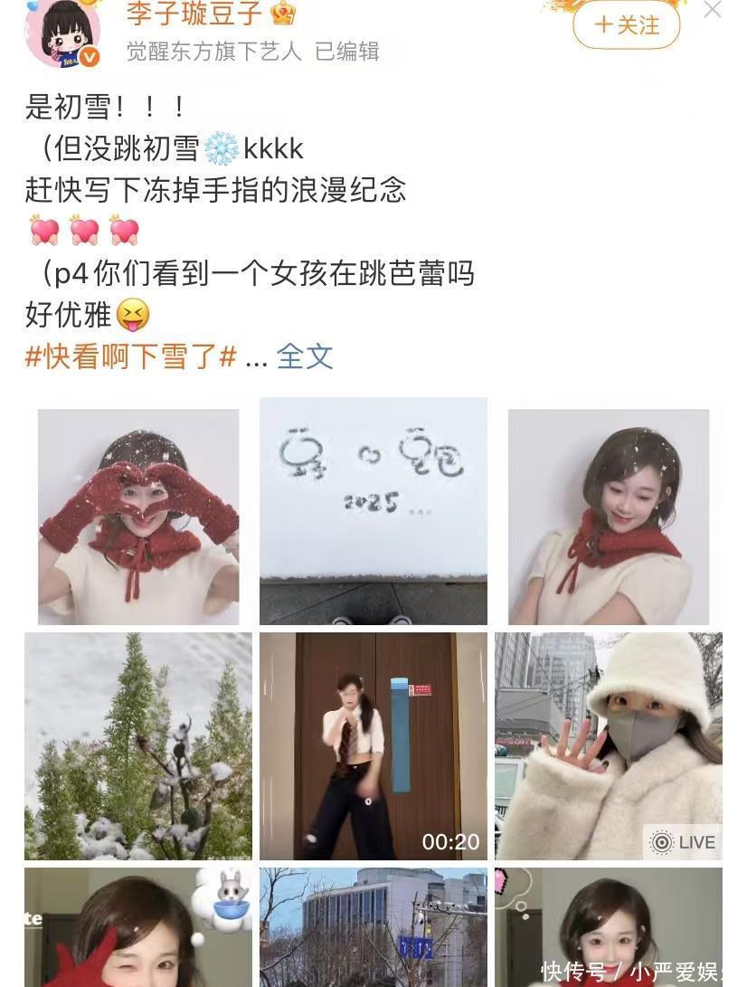 豆子李子璇真是拼了,在暴雪天居然敢穿短袖,为了美也是要风度不要温度的。今天很多明星都拍了在雪地里跳舞的视频,初雪是最唯美的自然馈赠。