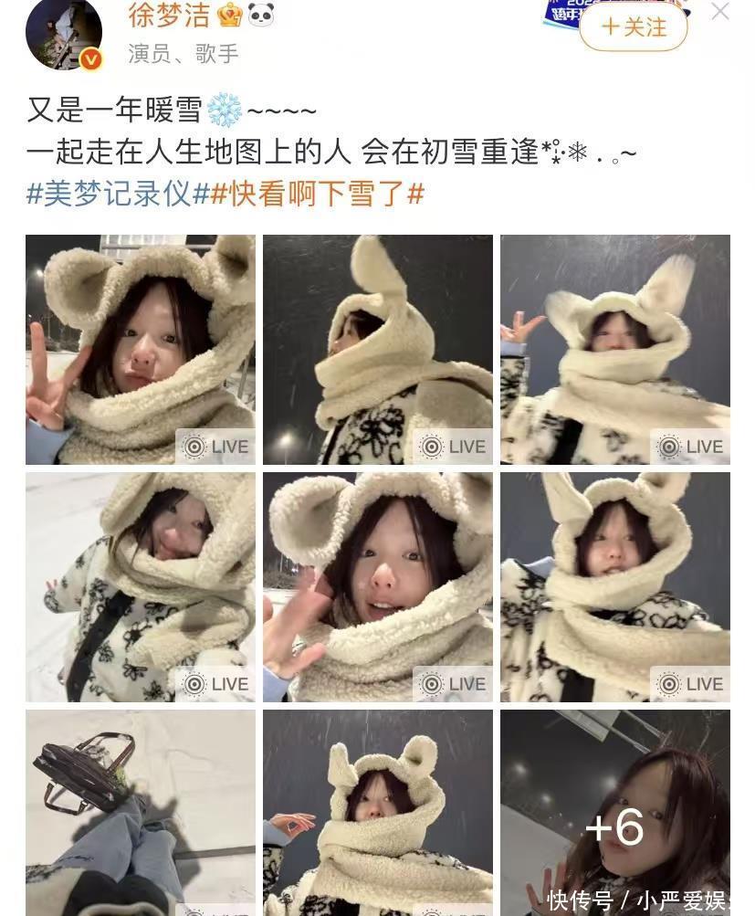 小彩虹徐梦洁简直是玩疯了,在大雪地里蹦跶,被冻的鼻子通红。特别喜欢她这句“一起走在人生地图上的人,会在初雪重逢”,又是小说情节里的画面感呀!