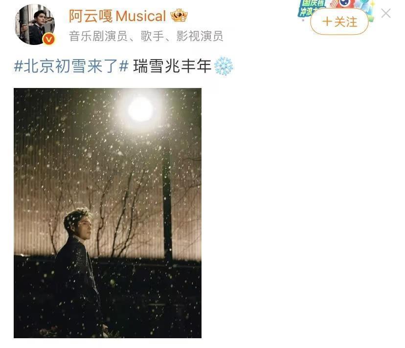 阿云嘎虽然只晒了一张照片,却唯美的像小说里的男主。瑞雪兆丰年,希望2026年是一个很好的年。